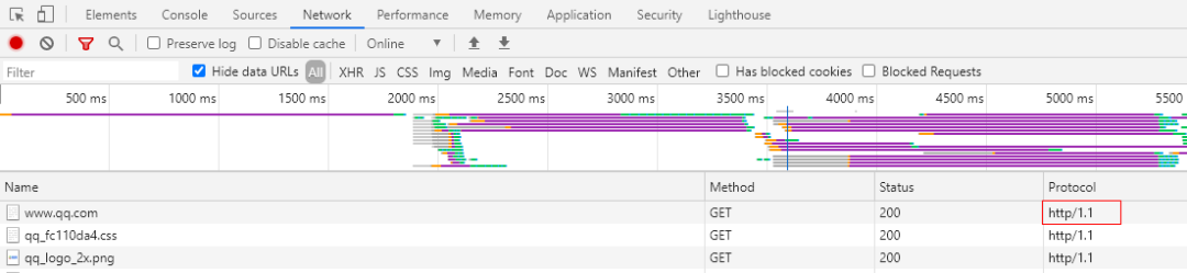可以看到在通过代理抓包的时候,协议变成了http/1.1