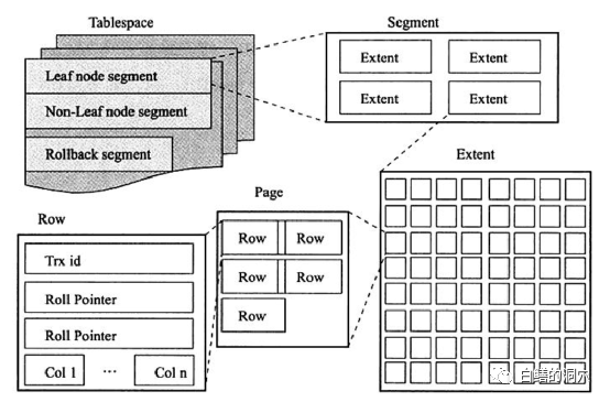 表空间是一个逻辑结构,可以被认为是innodb的顶层逻辑结构,所有的数据都必须属于某个表空间。默认的innodb引擎有一个ibdata1表空间,默认的数据都存储在这个表空格键中。如果设置了innodb_file_per_table参数,每张表都会创建独立的文件。不过只有表的数据、索引等会存储在每张表自己的文件中,UNDO数据、事务控制信息、INSERT BUFFER等仍然会存储在系统共享的表空间中。在Innodb存储引擎中,一张表会分为两个段,其中一个段是叶节点段,存储实际的数据,另外一个段是索引段,存储索引的指针信息。而表中DML的UNDO信息会存储在rollback segment中。