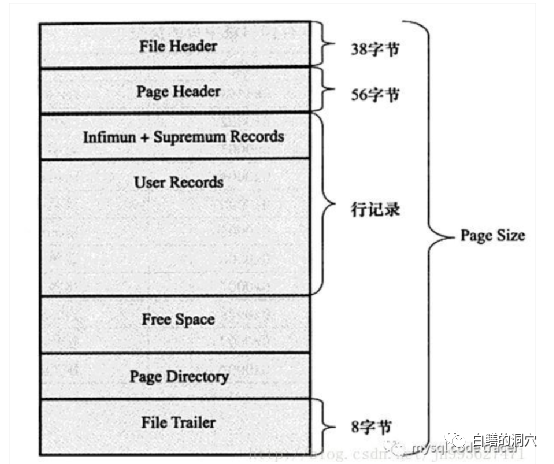 Innodb的PAGE结构与HEAP结构的类似,不过在空闲空间管理上是完全不同的。前面是FILE HEADER/PAGE HEADER,中间是数据记录,数据记录也是从低地址往高地址写,和Oracle相反。这是因为BTREE存储结构不需要和slotted page一样,在块里放一个指示器,其行指示器的功能被BTREE替代了。