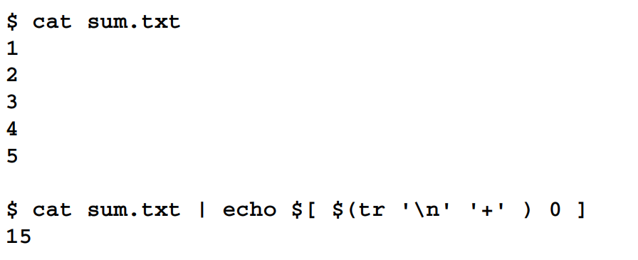 如果我们利用循环从文件中读取数字,然后再进行相加,那肯定得用几行代码。有了tr,只