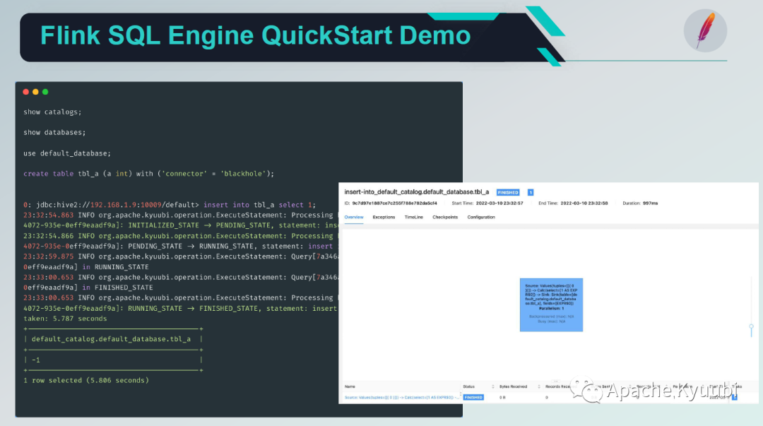 这是 Mac 本机的一个 DEMO,所以我们需要 Hadoop classpath 添加到加到 PATH 环境变量,并启动一个 Flink 本地集群。下一步就可以启动 Kyuubi Server,再利用 Kyuubi 自带的 Beeline 去连上 Flink Engine。Kyuubi 会自动拉起一个Flink Engine,它是一个 Java 进程。