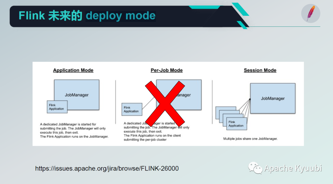 Flink SQL Engine 未来的计划,首先它的 deploy mode 会有一个很大的变化,主要是往 Application 模式和 Session 模式去提供支持,业界已经用得最多的,也是比较成熟的 Per-Job 模式会被废弃掉。Kyuubi 的 Flink Engine 未来应该主要是集中在 Application 模式,Session 模式也支持,但并不是第一选择。