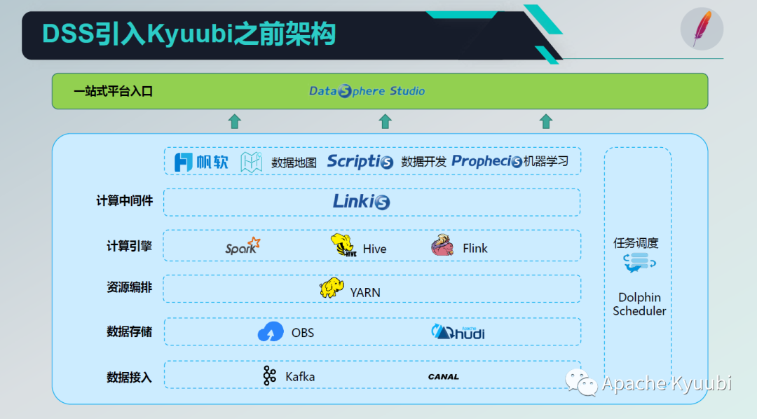 下图是 DSS 引入 Kyuubi 之前的架构,我们是通过 Kafka 和 CANAL 来定位数据,然后数据进入对象存储,以 Hudi 的格式保存在数据湖之上,资源编排是 YARN,计算引擎主要是 Spark、Hive 和 Flink。计算引擎通过计算中间件 Linkis 来统一管理交互,同时和 DSS 之间做了一个打通,在 Linkis 计算中间件之上构建了 BI 平台和数据地图,数据开发,机器学习等等,这多种平台通过 DSS 这个一站式的入口来统一进入管理。