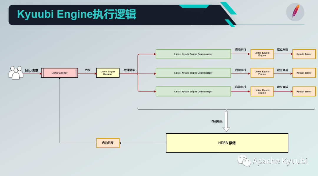Linkis 启动和 Kyuubi 之间的交互主要是通过 Linkis 的 Gateway 转发引擎的一个管理管理模块,通过 Linkis 的引擎管理模块会启动引擎的连接器管理,连接器管理是多个的,对接不同的用户、不同的引擎,来启动执行 Kyuubi 引擎。Kyuubi 引擎再和 Kyuubi Server 之间建立会话,然后通过和 Kyuubi Server 之间交互,比如说查询或者是 DDL 操作,会把这些返回的结果存储到一个 HDFS 临时目录里,该临时目录会返回之前的查询结果给 Gateway,Gateway 再返回给用户的一个实际客户端。