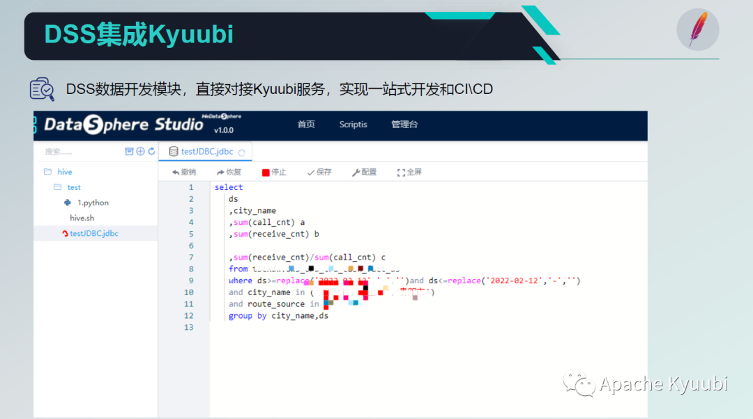 Kyuubi 在一站式平台的实际使用场景,可以看到 DSS 数据开发模块,我们直接增加了一个 Kyyubi 的类型。Kyuubi的类型直接对接 Kyuubi 服务,可以在上面通过一些 SQL 语句进行数据开发,并且实现一站式的开发和 CI/CD 的管理。