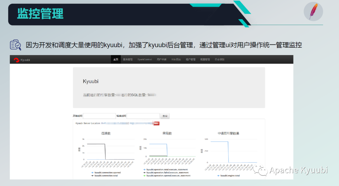 之前 DSS之上对 Linkis 有一系列的 WebUI 的监控管理,而 Kyuubi 在这方面是没有的,所以我们在这基础上加强了 Kyuubi 的后台管理功能,单独开发了一个 Kyuubi Web 的 Server 模块,通过 UI 对用户的操作进行统一的管理监控,主要是对 Kyuubi Server 端进行连接数、引擎数量、JVM 的监控。
