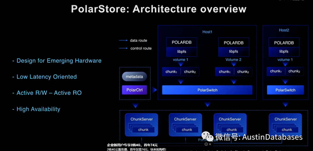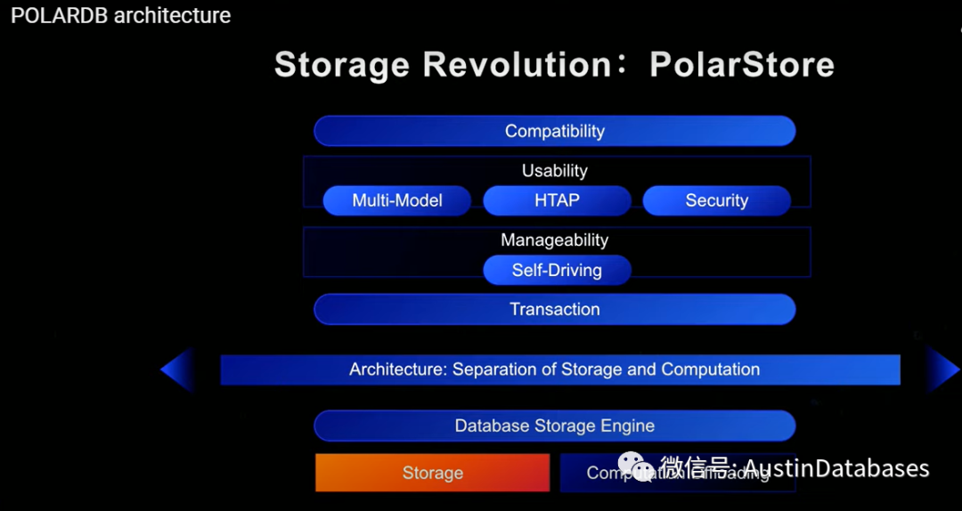 1 POLARDB 的底层 POLARStore ,Polarstore是整体是基于新型的硬件基础上进行的存储平台设计,在针对数据计算和存储中进行了数据计算与存储层的分离。在此基础上计算节点的扩容和存储节点的扩容,以及整体基于此硬件方式的 POSTGRESQL 和 MYSQL 都会快速的进行节点的扩展。