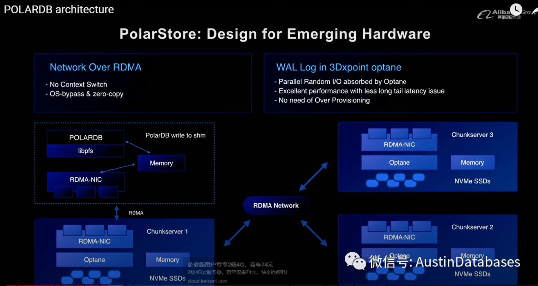 硬件方面使用了超高水平的NVMe 硬件设备, Remote Direct Memory Access RDMA, 这是一个内部通过直接内存访问的模式来进行远程直接内存访问是一种技术,使两台联网的计算机可以在不依赖处理器、缓存或操作系统的情况下交换主存储器中的数据。与基于本地的直接内存访问(DMA)一样,RDMA提高了吞吐量和性能,因为它释放了资源,导致更快的数据传输速率和更低的RDMA支持系统之间的延迟。