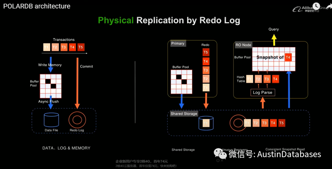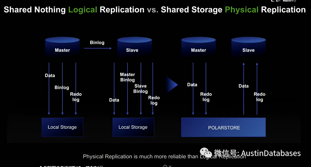 以上是基于在硬件层基础上的工作,同时在数据库的层面,对于shared nothing logical replication 的复制方式进行了改变,将复制改完了shared storage physical replicaiton 的方式。这对数据库的内核的源代码进行了修改。以MYSQL 为例,原来通过 binlog进行复制的方式,改变为通过redo log 在polardb store 的基础上进行纯物理方式的复制。