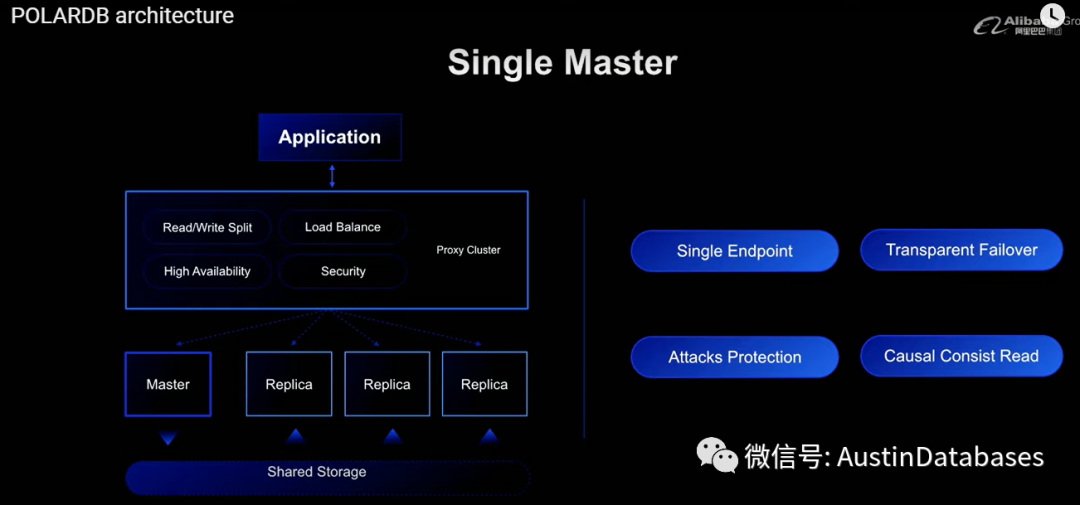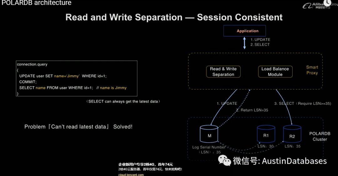 同时通过POLARDB的上层的代理层,将数据的访问进行读写的分离,通过读写分离模块与load balance 模块,来整体对数据库的访问进行接管。组件可以判断整体的读操作与主节点之间的是否同步来返回结果。