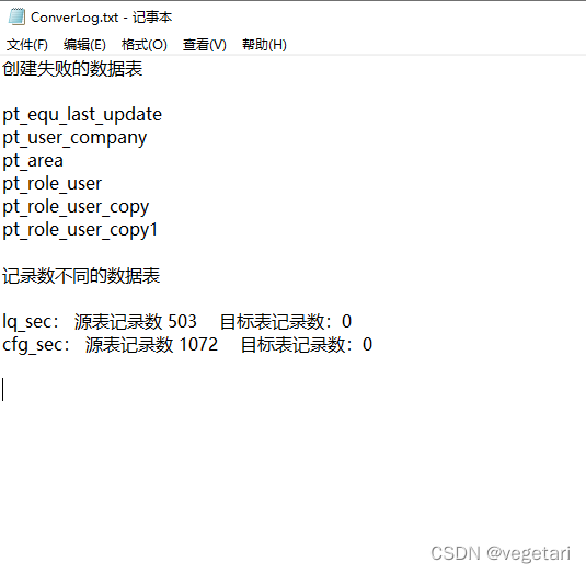 创建失败的表有六张,加上目标数据库的45张表,就是51张,可以对上了。下面还有元数据表中数据条数和目标数据表中数据条数不同的表。