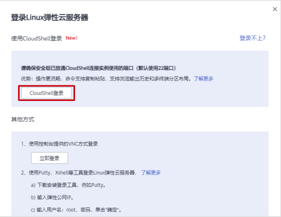 单击"CloudShell 登录",等加载完成后,输入 root 用户密码后点"连接"按钮即可登