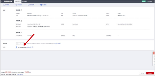 确认设置信息,尤其是配置费用,然后勾选协议"我已经阅读并同意《镜像免责声明》",点