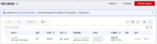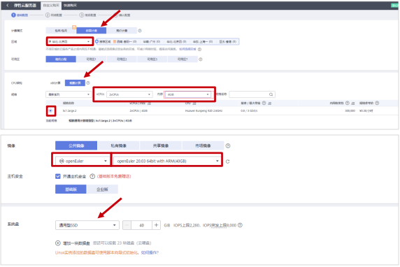 | 镜像 | 公共镜像: openEuler openEuler 20.03 64bit with ARM(40GB) |