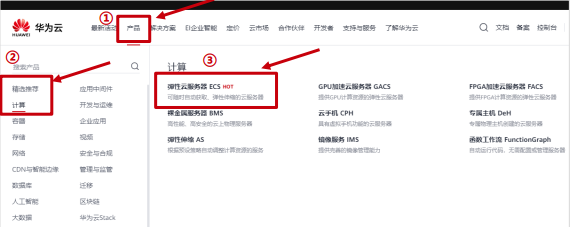 在华为云主页(https://www.huaweicloud.com/)选择产品,选择"精选推荐"下的"计