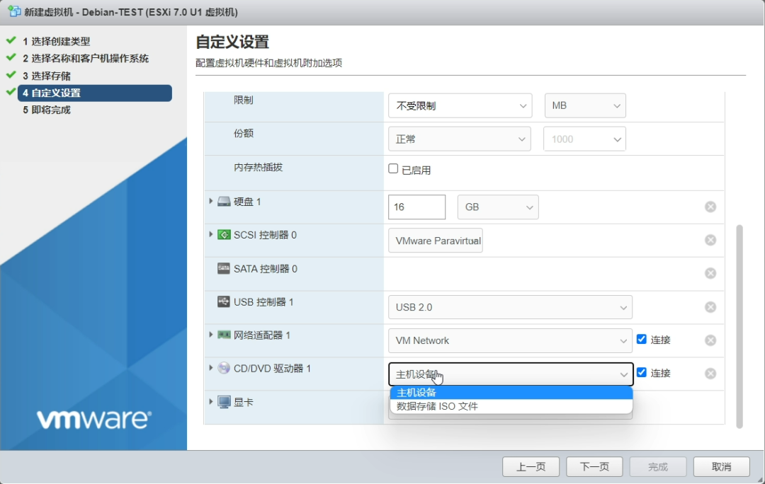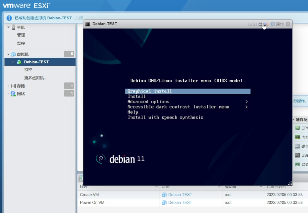 名称根据个人喜好设置,其他的选项按照上图设置。设置好之后点击“下一页”进入“选择存储”:这里就是选择虚拟机安装的位置,根据具体情况设置即可。之后点击“下一页”,进入“自定义设置”,默认的设置如下图:CPU核心数、内存大小以及硬盘大小的分配根据自己的需要设置即可。需要注意的是内存的设置。点击内存前的三角号展开详细设置,勾选“预留所有客户机内存(全部锁定)”,其他设置保持默认:另一个需要注意的地方是“CD/DVD驱动器1”的设置。这里要选择“数据存储ISO文件”:在弹出的窗口中选择前面下载好的Debian11镜像。笔者已经提前上传好了,如果你没有提前上传,也可以在本窗口点击“上载”,选择下载好的Debian11镜像进行上传,然后再选择上传好的Debian11镜像:点击选择后回到“自定义设置”,然后点击“下一页”进入“即将完成”:这一页显示了整个虚拟机的详细设置,如果有设置错误,回到相应的步骤重新设置即可。确认无误后点击“完成”,虚拟机就创建完毕了。点击浏览器窗口左边导航器的“虚拟机”就可以看到ESXi里所有的虚拟机,包括刚刚创建的虚拟机:点击刚才创建的虚拟机“Debian-TEST”,然后单击下图所示窗口里的“三角号”即可开启虚拟机并下载输出画面:至此,在ESXi上安装Debian11的准备工作就完成了。