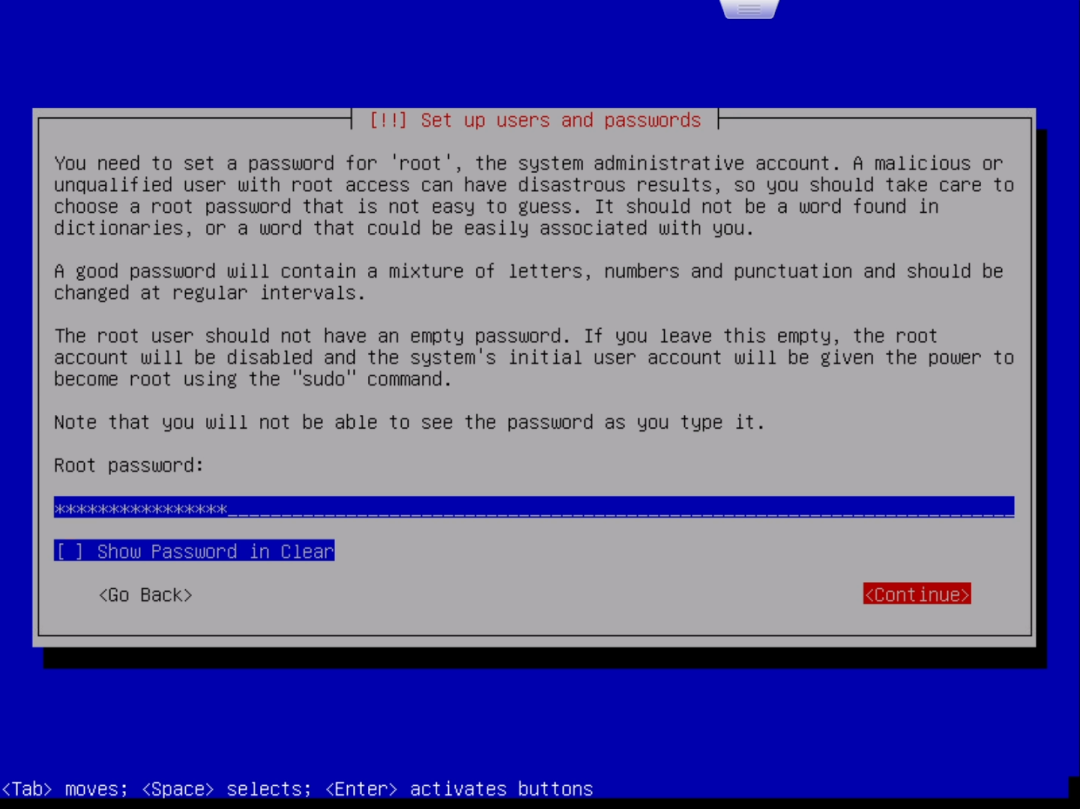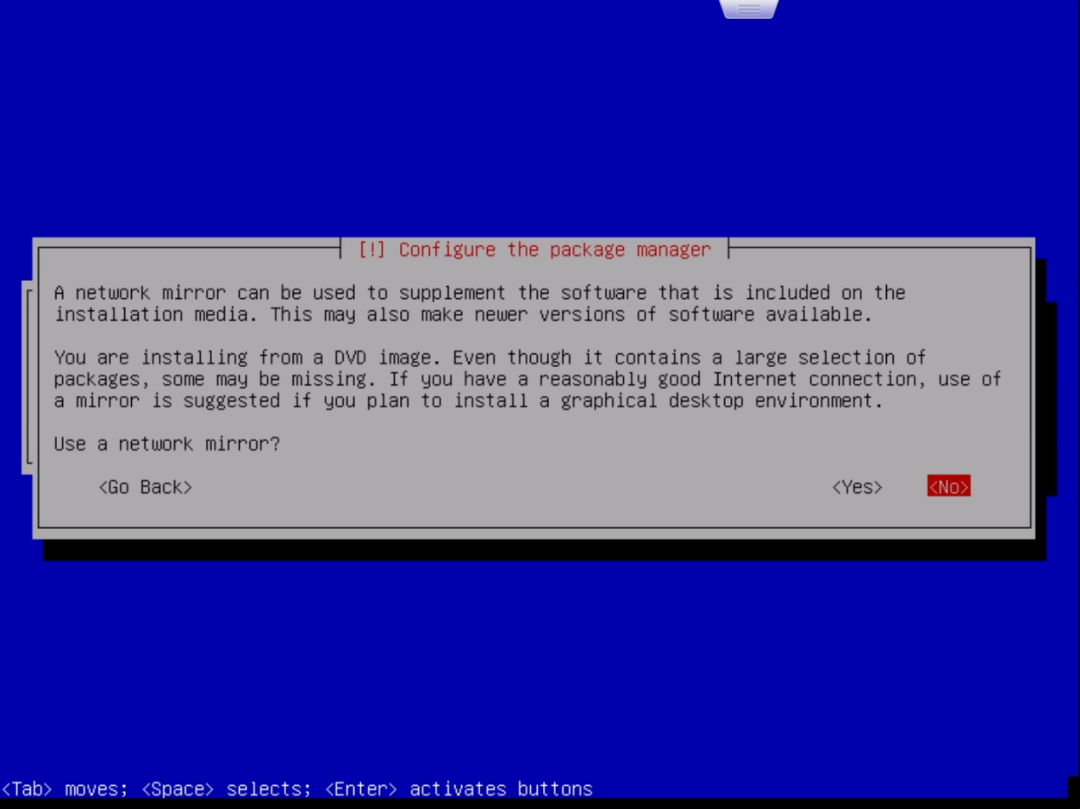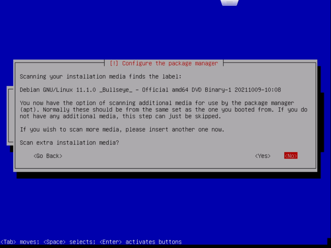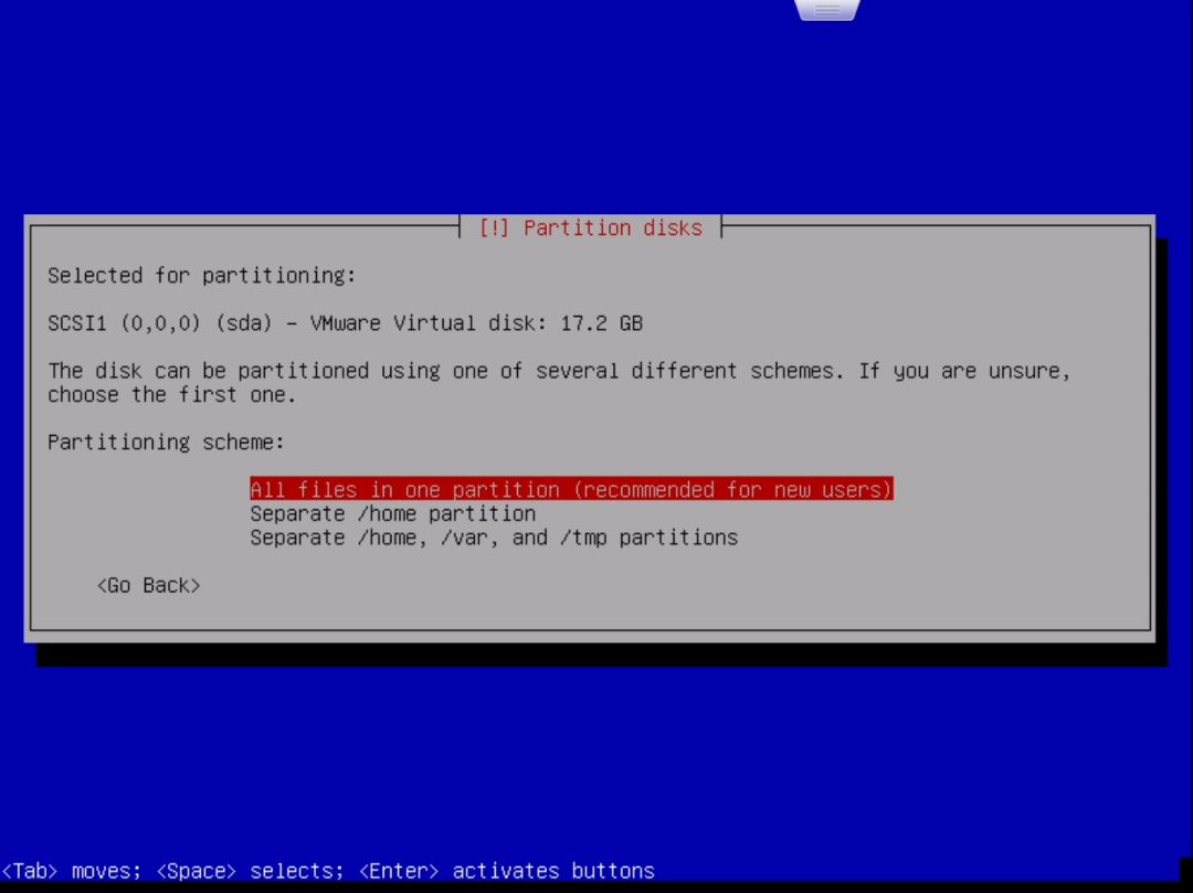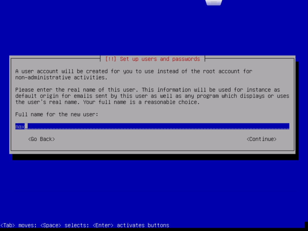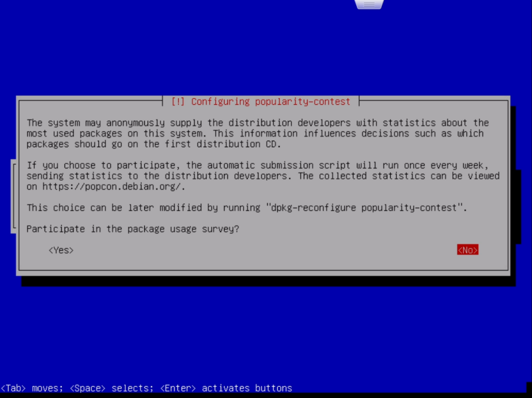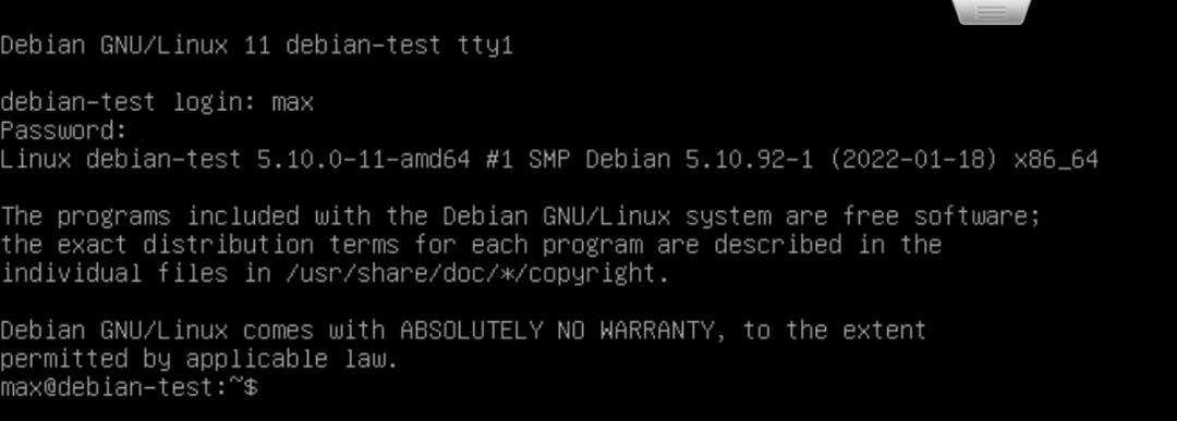 在输出的窗口中,首先要选择安装的选项,笔者这里选择的是“Install”而非“Graphical Install”即通过图形界面进行安装:选择 “Insatll”并回车就进入了语言选择界面。按上下方向键选择语言,按回车确认选择。为了以后方便命令行操作,笔者选择的是英语:回车后进入地区选择。地区决定了时区。笔者这里选择的是“Hong Kong”:回车后进入键盘布局选择。选择默认的“American English”即可:读条完成后会提示你设置“Hostname”即主机名,根据自己的喜好设置即可:设置好主机名后,连按两次回车或使用下方向键选中“Continue”再回车进入“Domain name”的设置,这里留空即可:设置一个非root账户的账户名,这个账户主要用来进行一些不需root权限的操作:选择第一项“Guided – use entire disk(使用整个硬盘)”,然后回车:选择第一项“All files in one partition (recommended for new users)”即“所有文件都在一个分区(推荐新手使用)”。然后回车:选择最后一项“Finish partitioning and write changes to disk(完成分区并将分区设置写入磁盘)”并回车。这时会再次确认是否应用分区设置:用左右方向键选择“Yes”并回车,之后就开始安装系统了:这个过程时间会比较长,直到提示“Scan extra installation media?”:选择No,然后提示“Use a network mirror?”:这个窗口是询问是否参加软件包使用调查,选Yes或No都可以。回车后会继续读条,但很快就会出现下面的窗口:这里需要选择想要安装的软件,按上下方向键移动选项,按空格键选择选项。默认的选项如上图。默认情况下是勾选了桌面环境的。由于笔者主要是在ESXi里使用,所以不打算安装桌面环境,而是安装SSH。笔者最终的选择情况如下:选择“/dev/sda”并回车,片刻读条后便会提示安装完成:选择“Continue”并回车后就会自动重启到Debian的登录界面:输入安装时设置的普通用户的用户名(笔者设置的用户名是max),回车后在“Password:”后输入对应的密码(注意,输入密码是不显示的,并不是没有输入进去)并回车,就进入了Debian系统了。至此,我们成功在ESXi上安装了Debian11。
