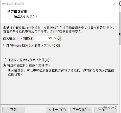 2.2.5 选择虚拟机磁盘大小。你可以随意选择限制内虚拟机的磁盘大小,这里由于后面的vcenter的安装,所以选择磁盘较大。然后点击下一步。