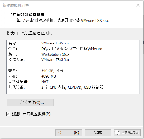 2.2.6 完成创建,你可以点击完成,虚拟机创建成功,你也可以选择点击自定义硬件,进行查看与修改。