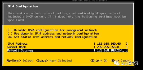 3.2 选择并进入configure Management Network。之后选择并点击IVp4 configuration,然后选择第三个,点击空格键,进行选择。然后修改网络。