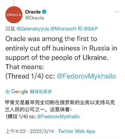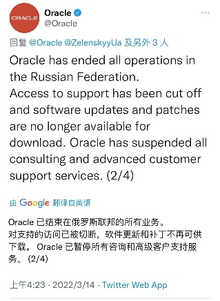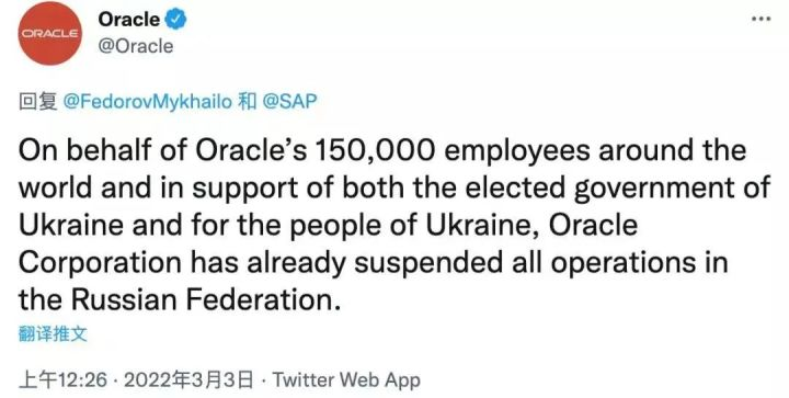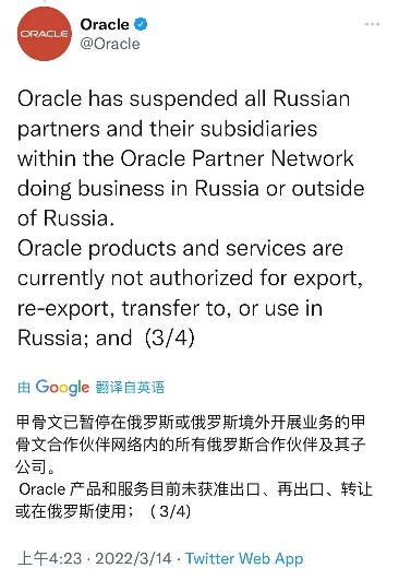 2022年3月3日,Oracle在Twitter宣布,甲骨文公司已经暂停了在俄罗斯联邦的所有业务。