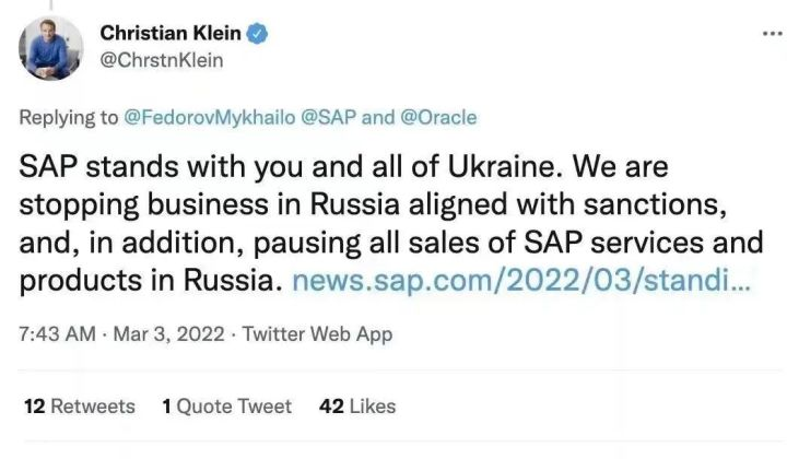 同日,德国知名软件企业SAP CEO Christian Klein也宣布,暂停在俄罗斯的所有SAP服务和产品的销售。