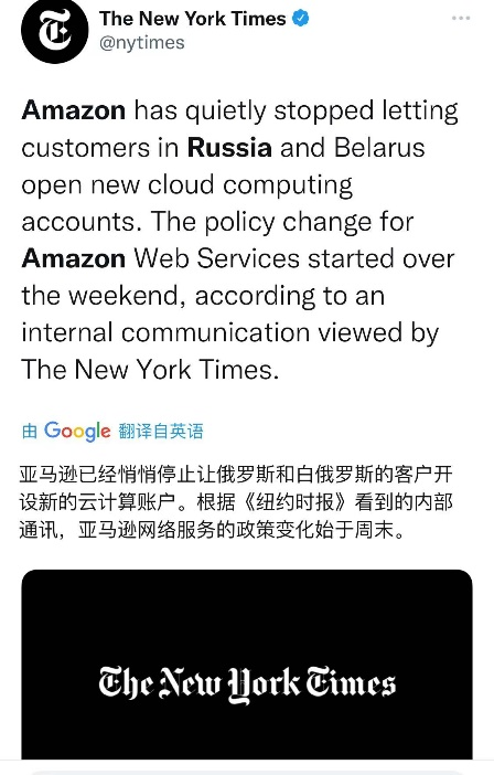 2022年3月8日,亚马逊宣布AWS将停止来自俄罗斯和白俄罗斯的新的注册。