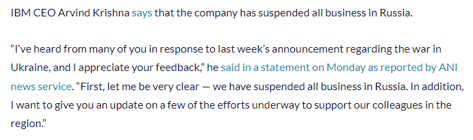 2022年3月8日,IBM CEO Arvind Krishna 宣布停止在俄罗斯的所有业务。