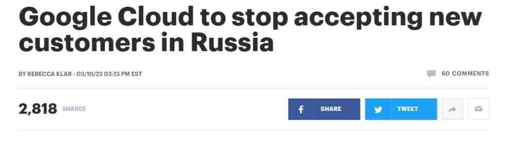 2022年3月10日,Google Cloud宣布停止在俄罗斯接受新的用户。