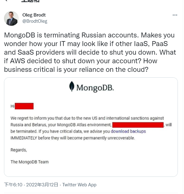 2022年3月12日,MongoDB也宣布停止在俄罗斯的服务。