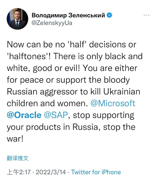 2022年3月14日,乌克兰总统泽连斯基仍在Twitter上敦促微软、Oracle和SAP不仅停止在俄罗斯的交易,更要停止对于在俄罗斯的产品的支持服务。