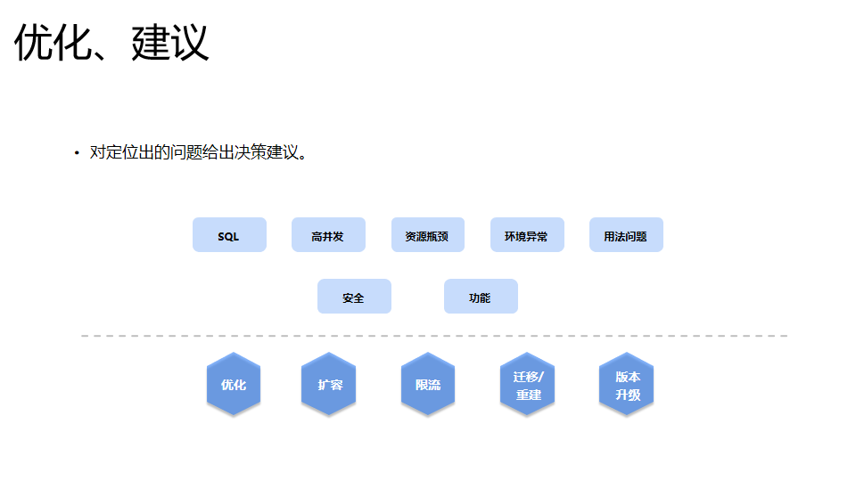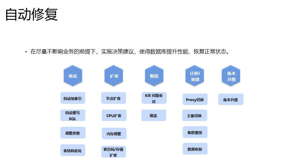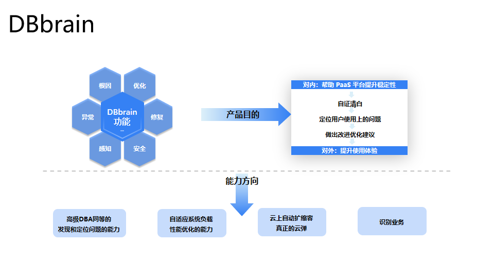 腾讯云数据库智能管家DBbrain产品研发负责人雷尚顺谈到数据库在自治方向上不断进步,但当前仍然处于半自动化阶段/局部自动化阶段。依托云基础设施,数据库内核的增强能力,以外挂的方式做好数据感知、异常检测、根因分析、优化建议和修复,全面实现数据库自治是可行的;同时在大数据场景下结合当前 AI 算法能力,能够突破传统人工经验的局限性。DBbrain 产品强调对数据库领域知识精细分析,并通过在实时闭环诊断、全量审计日志跟踪、业务模型结合几个方向发力,不断提升用户体验,支持好云上和云下数据库。
