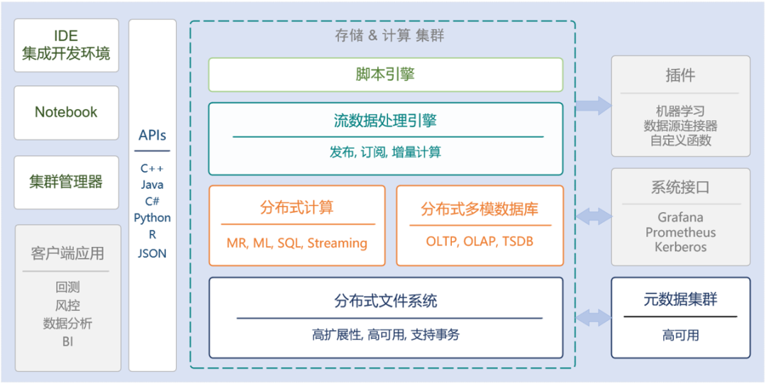 DolphinDB提供一站式解决方案,用户可在同一个系统内使用简洁高效的脚本语言快速开发大数据应用。DolphinDB内置的1000+函数,适用于多种数据类型(数值、时间、字符串)、数据结构(向量、矩阵、集合、字典、表)和系统调用(文件、数据库、分布式计算),可直接在数据库中进行复杂的计算和交互分析,避免了数据迁移,且大部分计算功能和函数都经过优化。