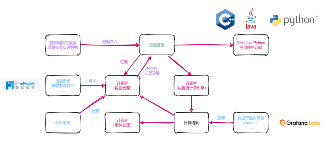 DolphinDB内置的流数据框架支持流数据的发布、订阅、预处理、实时内存计算、复杂指标的滚动窗口计算等,是一个运行高效,使用便捷的流数据处理框架。与其它流数据系统相比,DolphinDB流数据处理系统的优点在于:吞吐量大,低延迟;与DolphinDB时序数据库无缝集成,提供一站式解决方案;天然具备流表对偶性,支持使用SQL语句进行数据注入和查询分析。