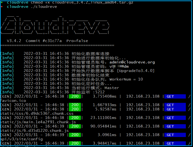 # 解压程序包tar -zxvf cloudreve_VERSION_OS_ARCH.tar.gz# 赋予执行权限chmod +x ./cloudreve# 启动 Cloudreve./cloudreve