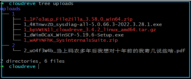 Cloudreve 支持多账号,不同用户登录到系统后,只能看到自己目录中的内容。在宿主机上,如果存储后端使用的是文件系统,则不同用户的文件存在各自用户ID下,目录结果如下: