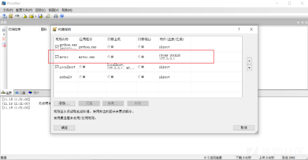 4、使用工具proxifier,设置远程桌面软件mstsc.exe的数据包从本地的3344端口出网。