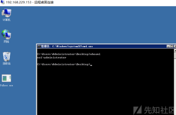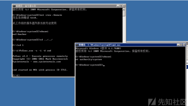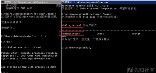 7、在通过PTH弹出的命令提示符中通过../跳转到PsExec.exe文件所在目录,执行命令提权获取一个域控机器的cmd命令提示符。