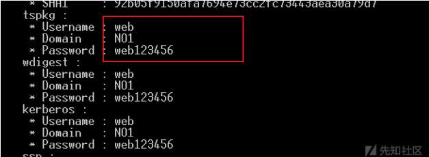 3、使用sekurlsa::logonpasswords读取到内存中的管理者账号的明文密码和本机的web用户的密码。
