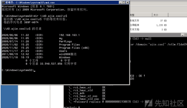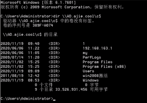 6、执行完之后会弹出一个命令提示符,执行dir \AD.ajie.cool\c$成功无需账号密码获取了域控机器的c盘的权限,列出了c盘的文件。
