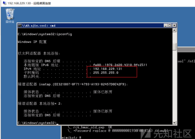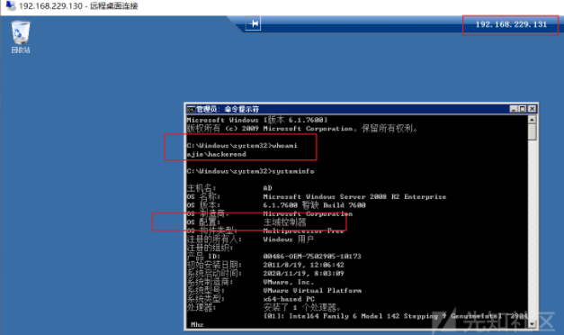 8、执行ipconfig可以看到是域控所在机器的IP地址,成功拿到域控所在机器的权限。