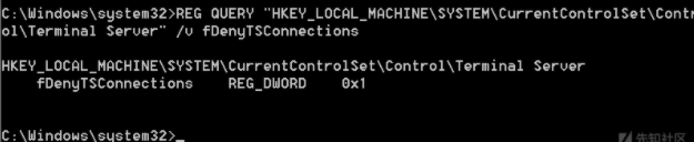 REG QUERY "HKEY_LOCAL_MACHINE\SYSTEM\CurrentControlSet\Control\Terminal Server" /v fDenyTSConnections