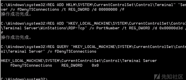 11、通过reg命令查询注册表,查看远程桌面服务发现返回0x01,说明远程桌面服务没有开启。(开启则返回0x00)