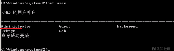 使用net user domain命令获取内网的域为ajie.cool,域中具有Administrator、Guest、krbtgt、web用户。