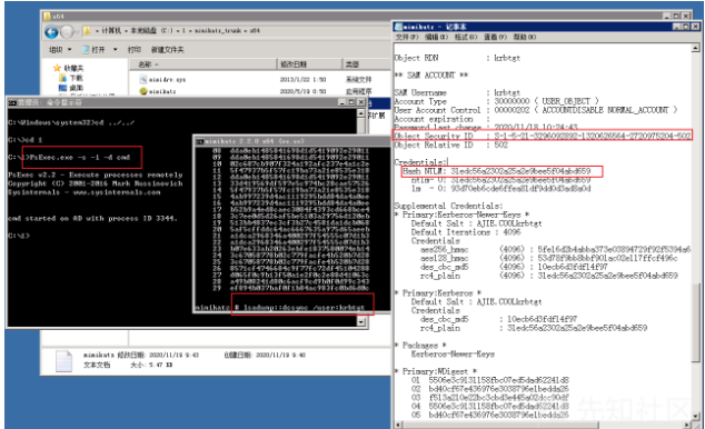 2、通过PsExec提权为SYSTEM,然后执行mimikatz,输入命令lsadump::dcsync /user:krbtgt 获取krbtgt的hash值。