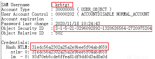 在查询域内用户的时候,总会看到一个用户叫krbtgt,如图5-37所示。krbtgt账户其实就是KDC秘钥分发中心用的超管账户。我们拿着krbtgt账户的票据,去访问域内机器,目标主机会认为我们是KDC秘钥分发中心,所以直接给了最高的权限允许我们访问。