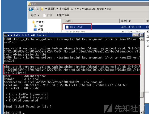 4、退出远程桌面,在攻击机通过mimikatz制作黄金票据。执行命令后会生成一个AD.kiribi文件。
