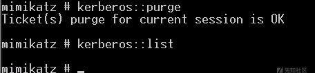6、通过kerberos::purge清空票据缓存;kerberos::list列出票据显示为空,说明清空了所以票据。