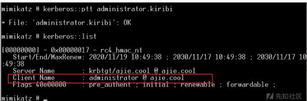 7、通过kerberos::ptt administrator.kiribi加载生成的票据。